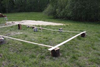 - Mittaa karkeasti kehikon paikka. Jätä riittävästi veistotilaa kehikon ympärille hirsien käsittelyyn. Ota lapiolla mahdollinen lumi pois pölkkyjen kohdalta tai tasoita epätasainen pinta. Jos maa on upottava tai upottaa talven väistyessä laajenna pölkyn alla olevaa pintaa esimerkiksi betonilaatalla tai levyllä.