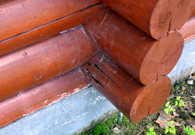 [muokkaa]Kuvassa väärin rakennettu märkätila on valuttanut vettä alimpiin hirsikerroksiin ja laho on edennyt tiiviin pintakäsittelyaineen alla. Puukko työntyy hirren läpi.