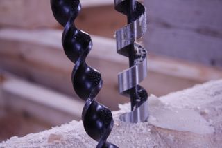 - Kuvassa nähdään aito hirsikaira ja sähkömiehen puuporanterä. Kiinnitä huomiota kierteen leveyteen. Sähkömiehen kaira on erityiesti tarkoitettu kuivan sahatavaran poraamiseen, ei tuoreen hirren.