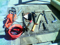 - Porakone reikien poraamiseen. Vähintään 700 W, muita yleisiä kokoja 1200W. Konemerkkejä esimerkiksi Milwaukee, DeWalt, Makita, Black & Deckerin vanha sininen porakone.