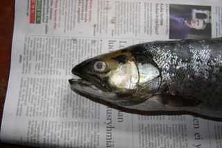 [muokkaa]Rainbow Trout, Oncorhynchus mykiss, , regnbågsforell. Kotoisin Pohjois-Amerikasta. Suomeen 1950-luvun lopulla. Luonnonvaraisesti ei lisäänny, ilmeisesti kutuajan huhti-toukokuun veden happamuuden takia ja taimenen sekä hauen kilpailun kanssa. Kasvatus aluksi lohilammikoissa, nykyään Saaristomerellä 15-16 milj.kg. Steelhead trout tarkoittaa merivaelluksen tekevää. Saariston kirjolohet karanneita. 40-70 cm, 1-5 kg. Evissä täpliä. Kyljessä punainen juova, joka häviää lähes vapaaksi päässeistä.