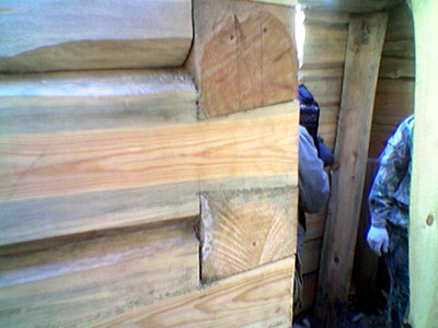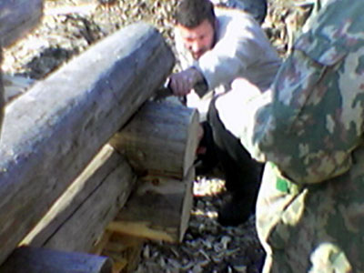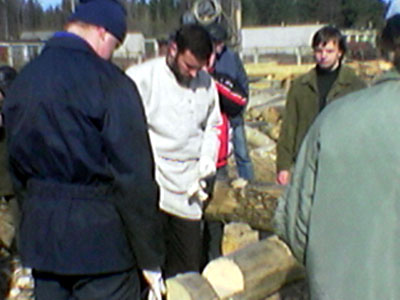 Seminaariin sisältyi seuraavana päivänä yrittäjän veistopaikalla Petroskoin läheisyydessä hirsityöesityöesityksiä ja käytännön harjoittelua. Kuvassa näkyvä vaaleaan paitaan pukeutunut tummahiuksinen mies (XX etsi nimi tähän XX) toimi kouluttajana.