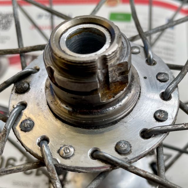 - Irrota vasemmalta keskiön ulkopuolella oleva mutteri. Siinä on kaksi hahloa, joita naputtamalla samoin aukeaa myötäpäivään, mutteri saadaan irrotettua. Lyö mahdollisimman loivassa kulmassa napakasti, jolloin isku on tehokkaampi. Lyö lyöntituurnalla tai ruuvitaltalla.