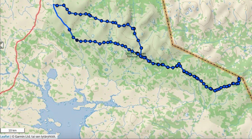 - Kartalla näkyvät siniset pallot ovat Garmin InReach Mini:n 30 minuutin välein vaellettaessa lähettämiä paikkatietoja Garminin MapShare-kartalle. Huomioitavaa, että lenkin ulkopuolinen "hännänpää" on kuljettu edes takaisin samaa reittiä.